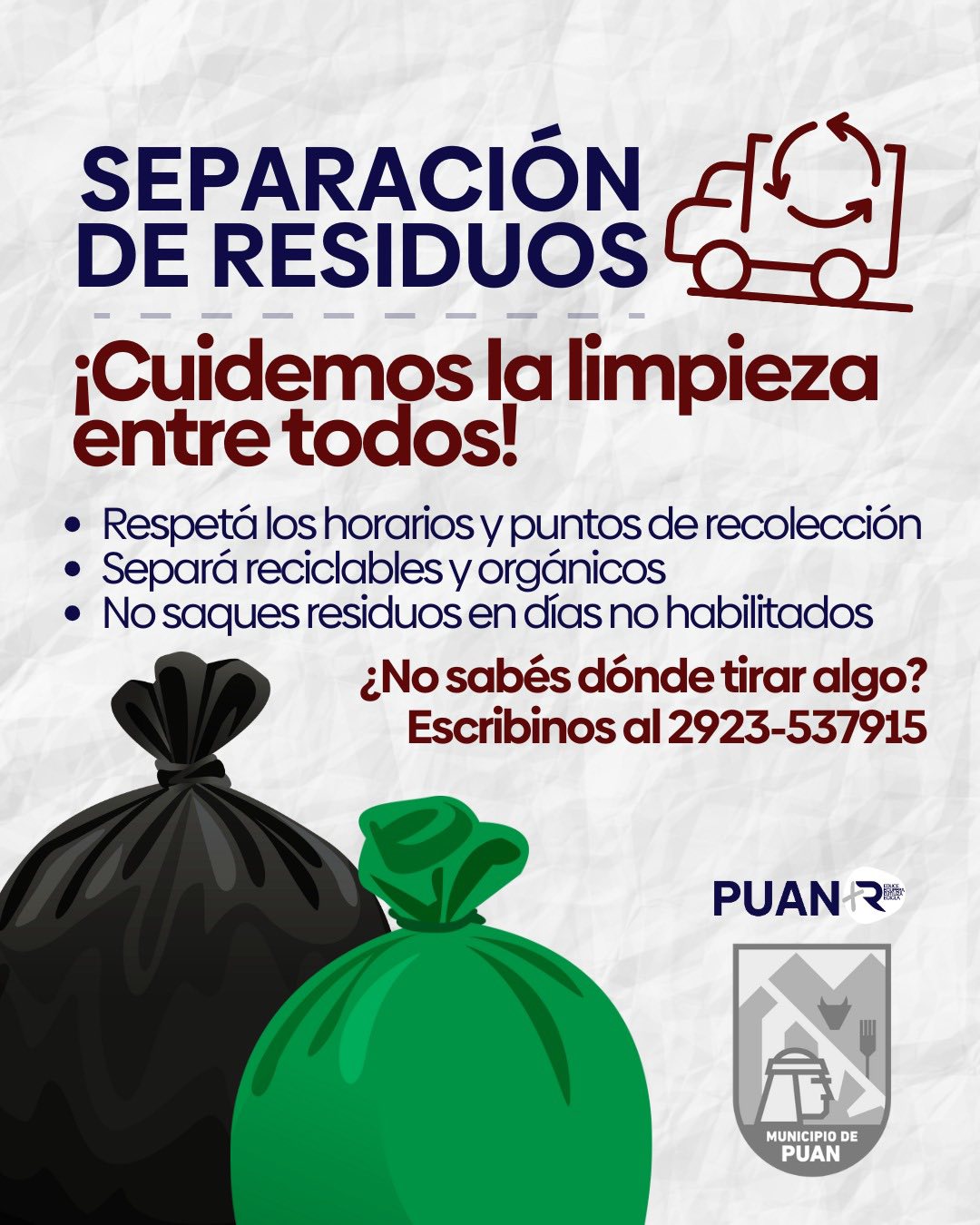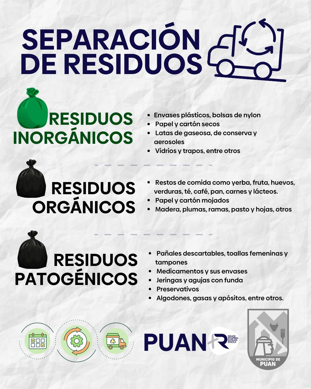 El Municipio de Puan, a través del Área de Ambiente, implementa un sistema de clasificación y tratamiento de Residuos Sólidos Urbanos (RSU) con el objetivo de promover la separación en origen, recuperar materiales reciclables y avanzar hacia una gestión ambiental sostenible en todo el Distrito. Actualmente, funcionan tres plantas de clasificación en distintas localidades: 17 de Agosto, Darregueira y Villa Iris.